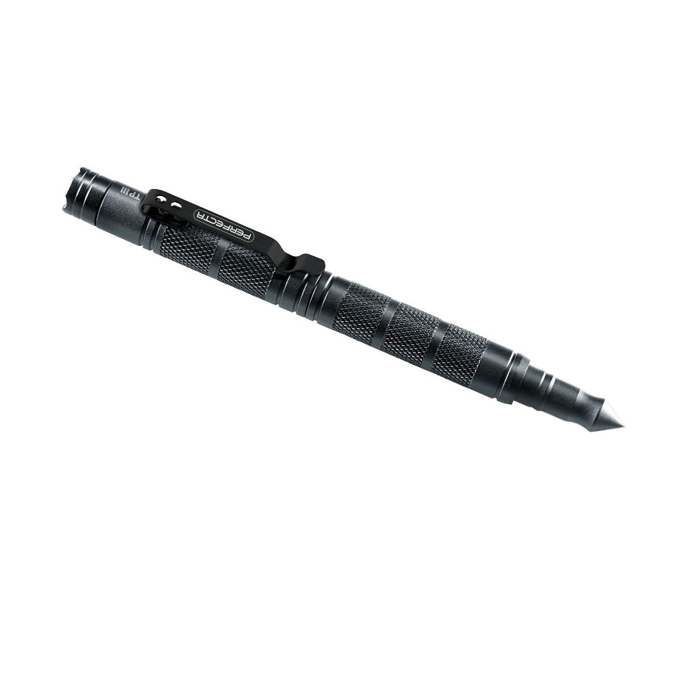 Der Tactical Pen TP III aus robustem Aluminium ist mit einer Steckkappe mit integrierter LED-Leuchte und Clip ausgestattet.
